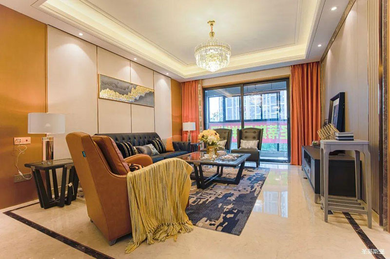 愛馬仕橙的休閑椅是空間的點(diǎn)睛之筆,相對于霸氣沉穩(wěn)的墨綠雙人沙發(fā),它更為時(shí)尚摩登,兩者合理搭配,賦予了空間陽剛與柔情并存的意境。