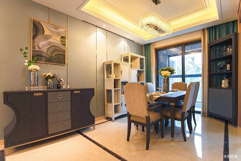 米白色餐邊柜坐落餐廳一角,簡約沿框線條,層次分明。金屬半圓與實(shí)木鑲嵌,盡顯優(yōu)雅輕奢的姿態(tài)。