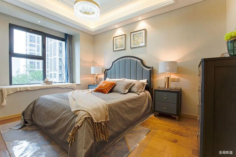 次臥高床屏由金屬鑲嵌,呈現(xiàn)簡約有序的線條,霧霾藍(lán)床屏與淺藍(lán)朦朧裝飾畫,窗簾相呼應(yīng),色澤搭配和諧自然,無不透漏著一種簡潔大方視覺體驗(yàn)。