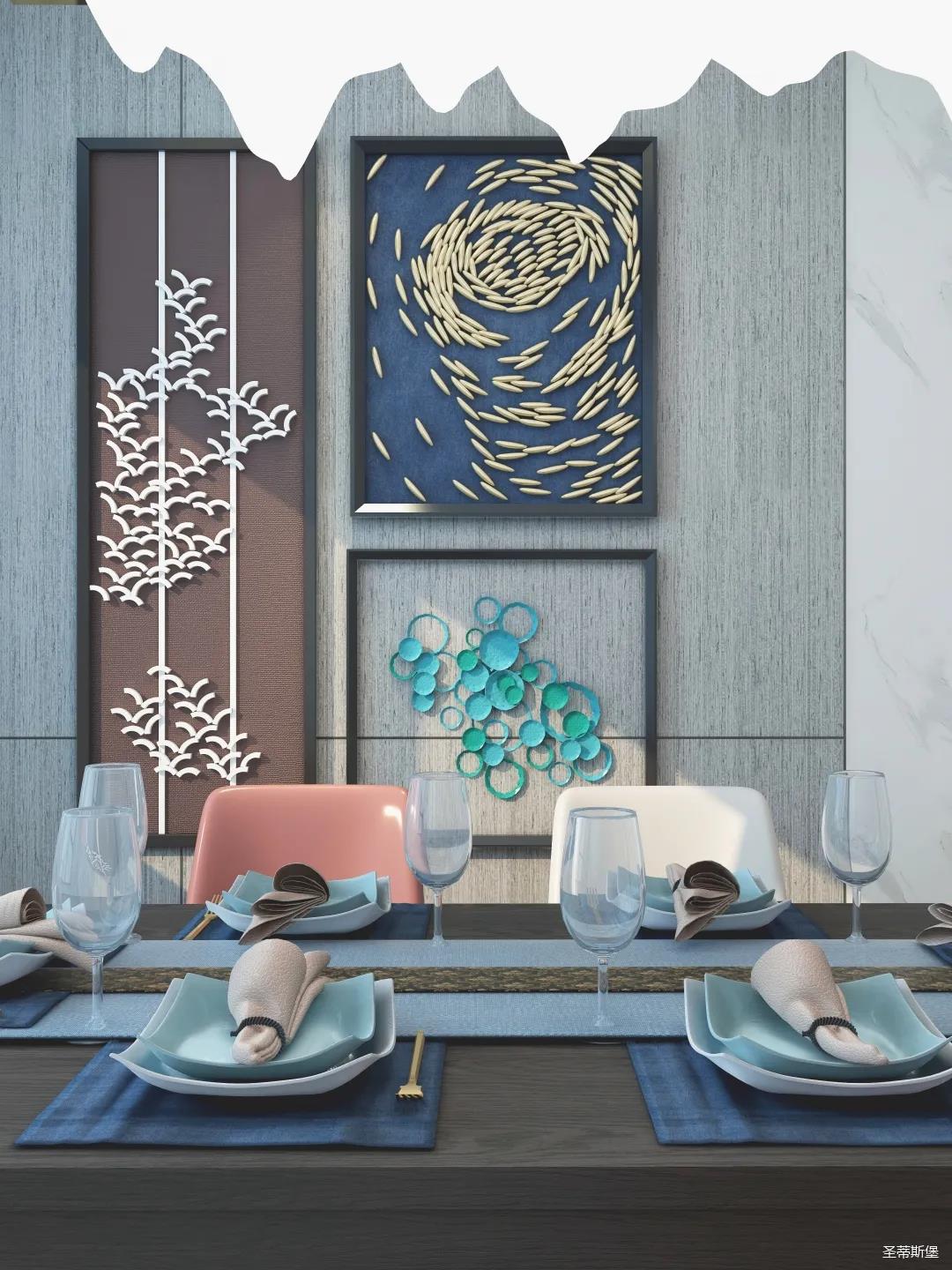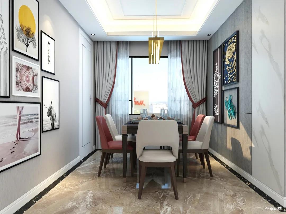 客廳與餐廳雖分兩個空間展開,但無明顯隔斷,室內一眼望去,清透明亮,就近靠窗可引入秀麗美景,迎來充沛的陽光。造型燈線條也頗有意境,讓空間圓潤生動起來,整體顯得大氣雅致,輕奢有范。軟裝搭配的選擇也極為重要哦,好的搭配才能彰顯品位,色彩跳躍的裝飾畫,讓整個空間鮮活生動,飽滿有趣。