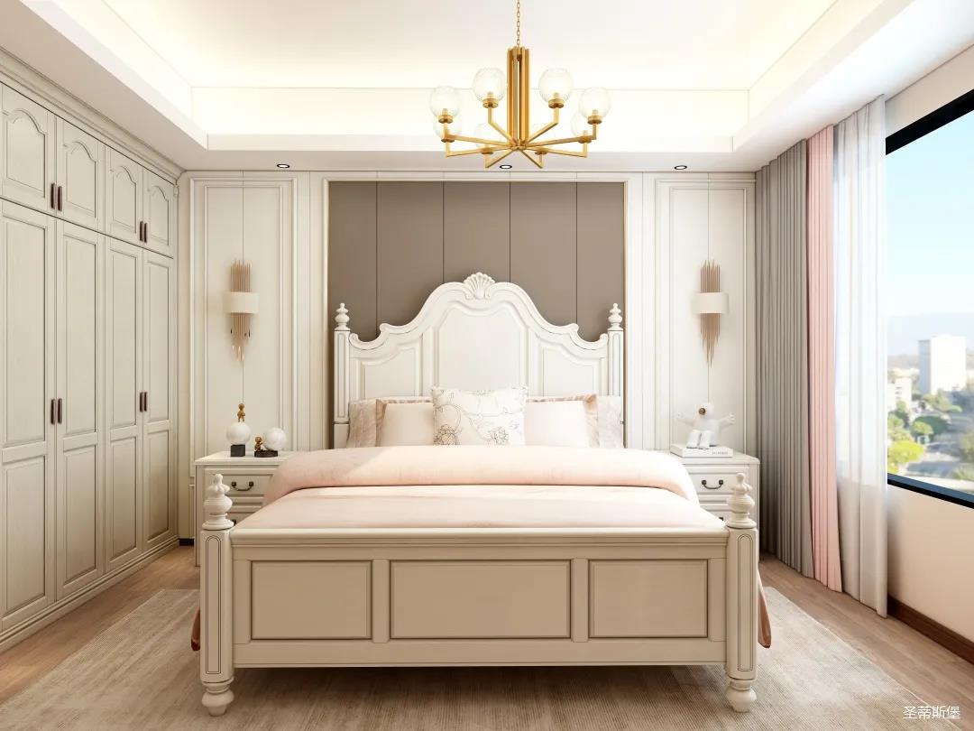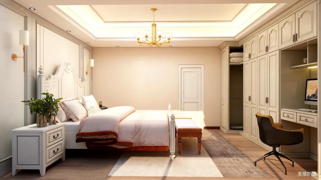 次臥的設(shè)計(jì)更注重收納,人性化嵌入式書桌,整排衣柜設(shè)計(jì)有效的利用了空間每一個(gè)角落。床屏在保持原有美式家具特色的同時(shí),增加了線條美,將繁雜的雕琢簡化,并融入時(shí)尚的美式元素,壁燈,吊燈糅合自然光影,完美呈現(xiàn)出尊貴的空間格調(diào)。