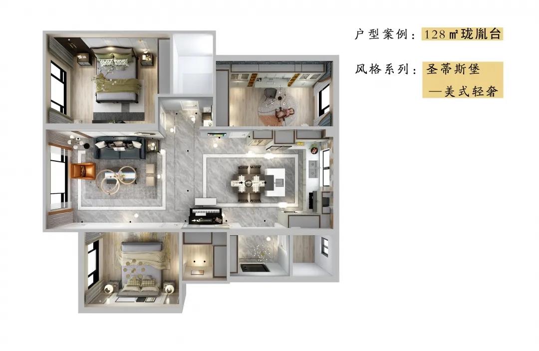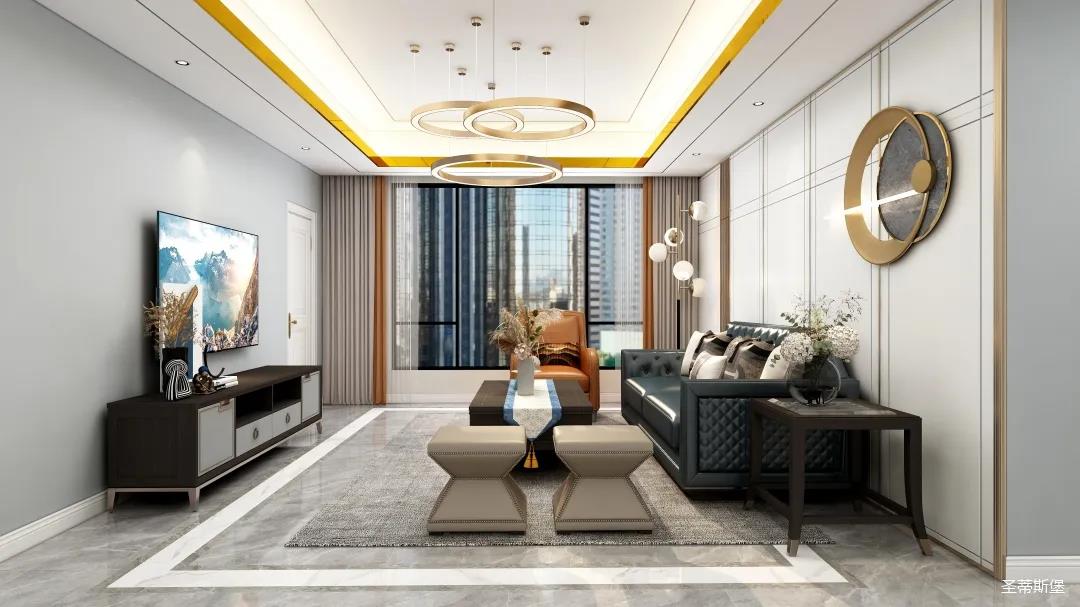 客廳延續著美式輕奢的氣韻,背景墻被簡約有序的金屬線條分割,營造出質感空間的細膩。沙發沉穩又不失時尚,色彩混搭更是讓人耳目一新,展現著美式風格天性自由不羈的浪漫個性。