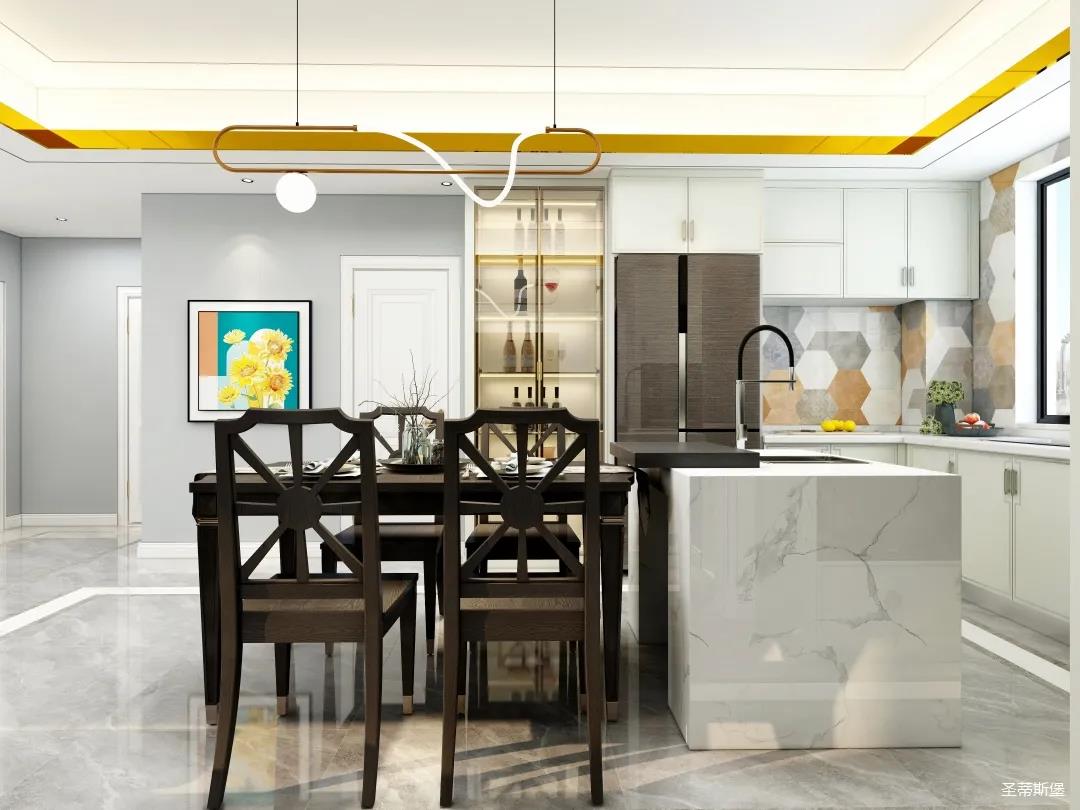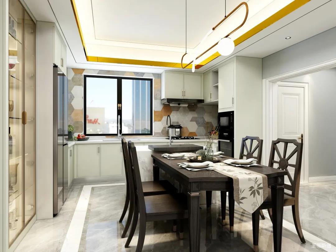 儀式感的餐廚空間,應在自然光影中跳躍。從設計搭配細節將美式開放,不設限的特性顯現,實木餐桌線條簡約且剛毅,中島臺鏈接起用餐空間的隨性,不遺余力的拉伸空間的層次感。