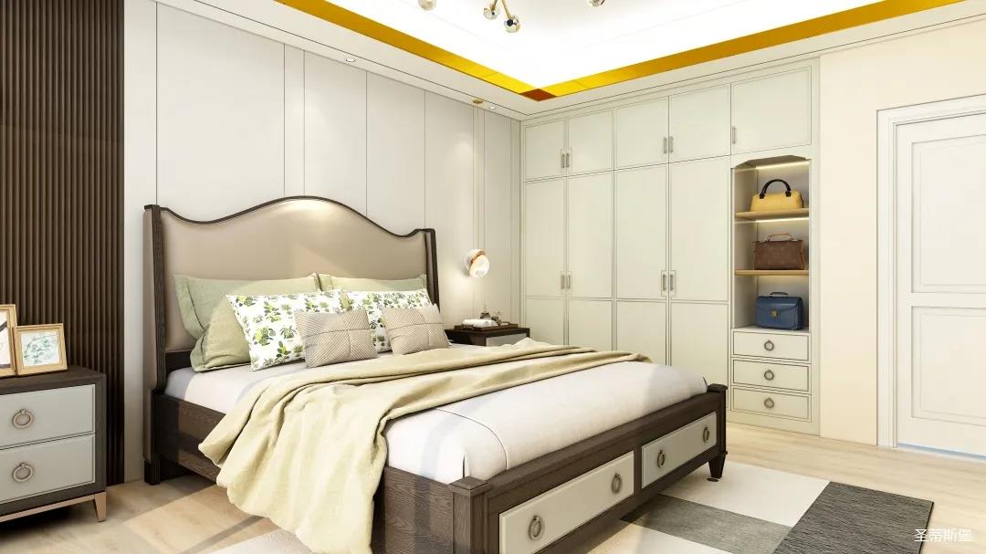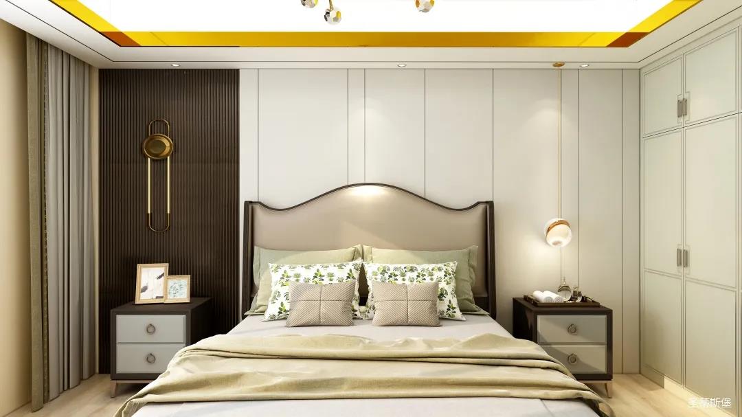簡約象牙白木飾面與棕色線性條紋木飾面等比劃分,從色彩裝飾上瓜分整個臥室空間,一面簡約雅致,一面低調奢美。
