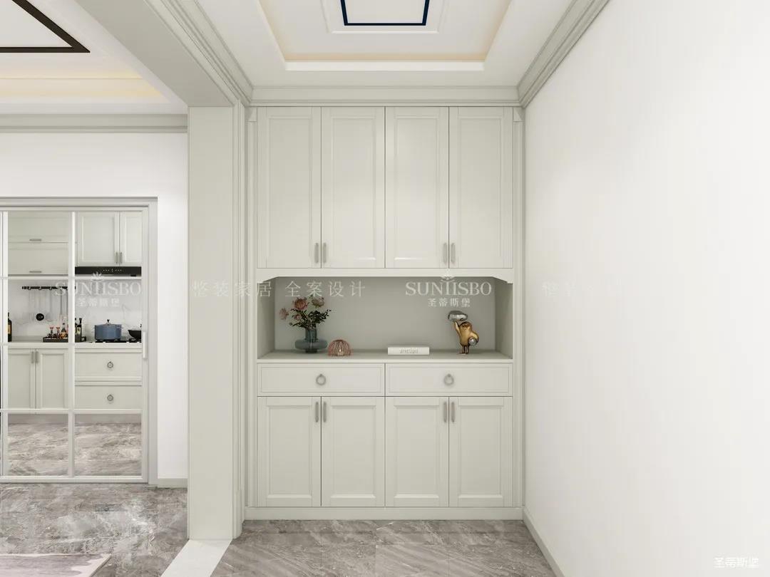 玄關(guān)整體遵循了對稱美的設(shè)計,仿古白柜體在留白區(qū)域的襯托下,產(chǎn)生了若隱若現(xiàn)的隱形美。柜體儲物功能強(qiáng)大,中空部分可以放置入戶零碎物品。貼心的設(shè)計讓出入戶隨即變得方便又舒適。