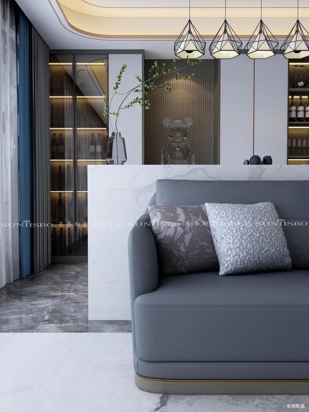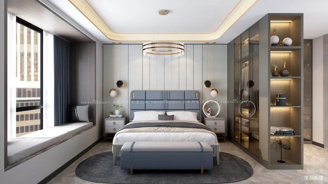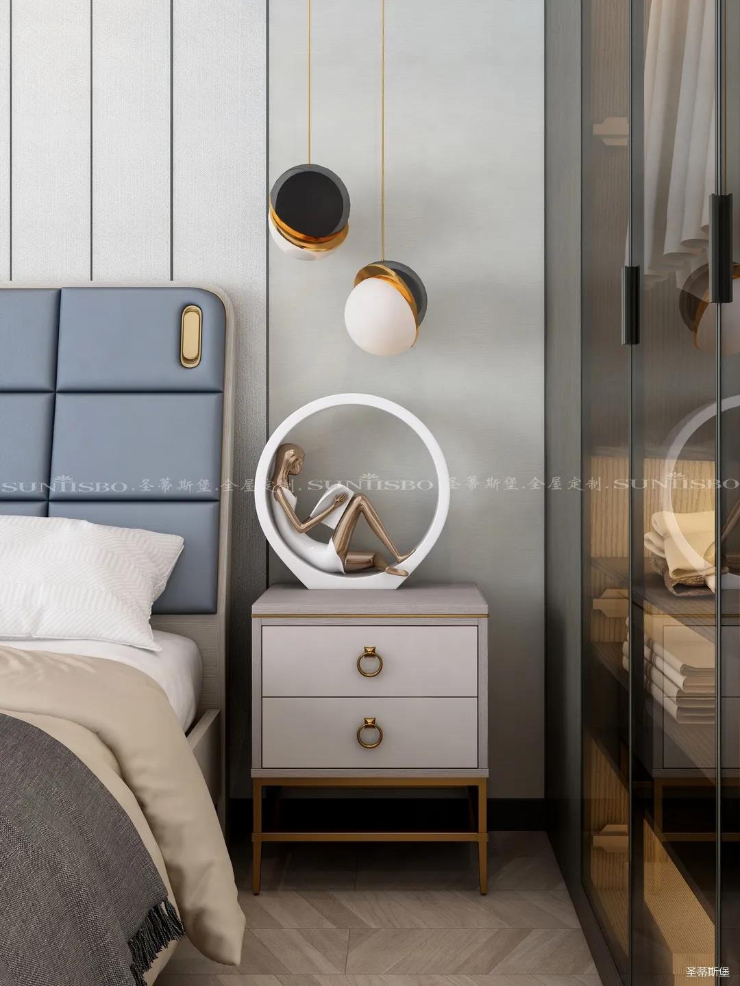 臥室的設計繼續延續著空間的高級灰,藍灰色彩的對比,讓主臥空間層次感更加豐富,充足的陽光隨意散落,空間更加溫暖大氣,對稱的球形吊燈設計,恍如兩個“快樂星球”,展現著空間應有的藝術性,設計師巧妙地設計,營造出與眾不同的生活品質。