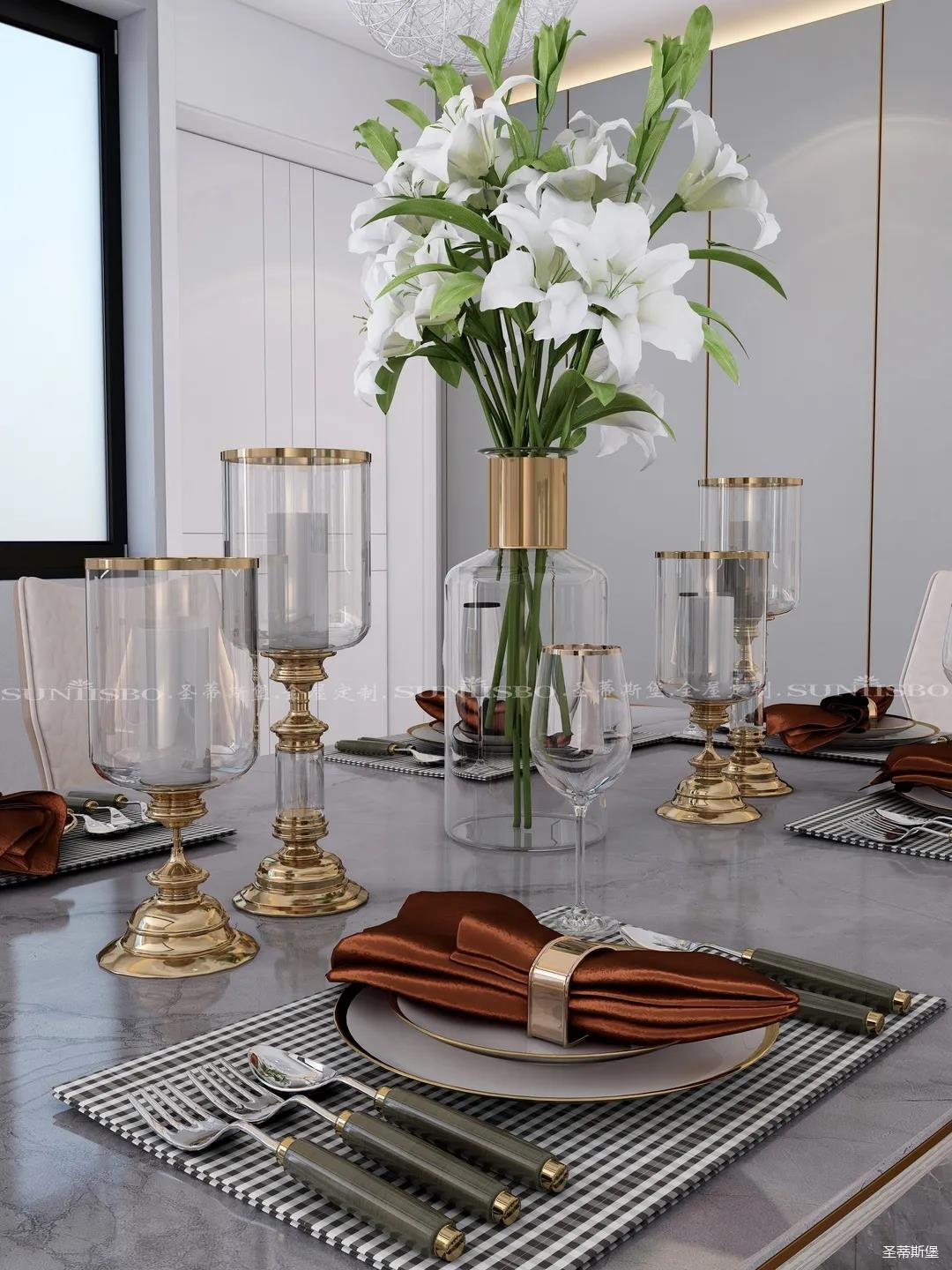 一束百合成了整個空間焦點,配套餐具是我和老公為新家精挑細選的,它讓用餐氛圍充滿了儀式感,讓我們在家的每一用餐時刻都像是在向對方深情告白。