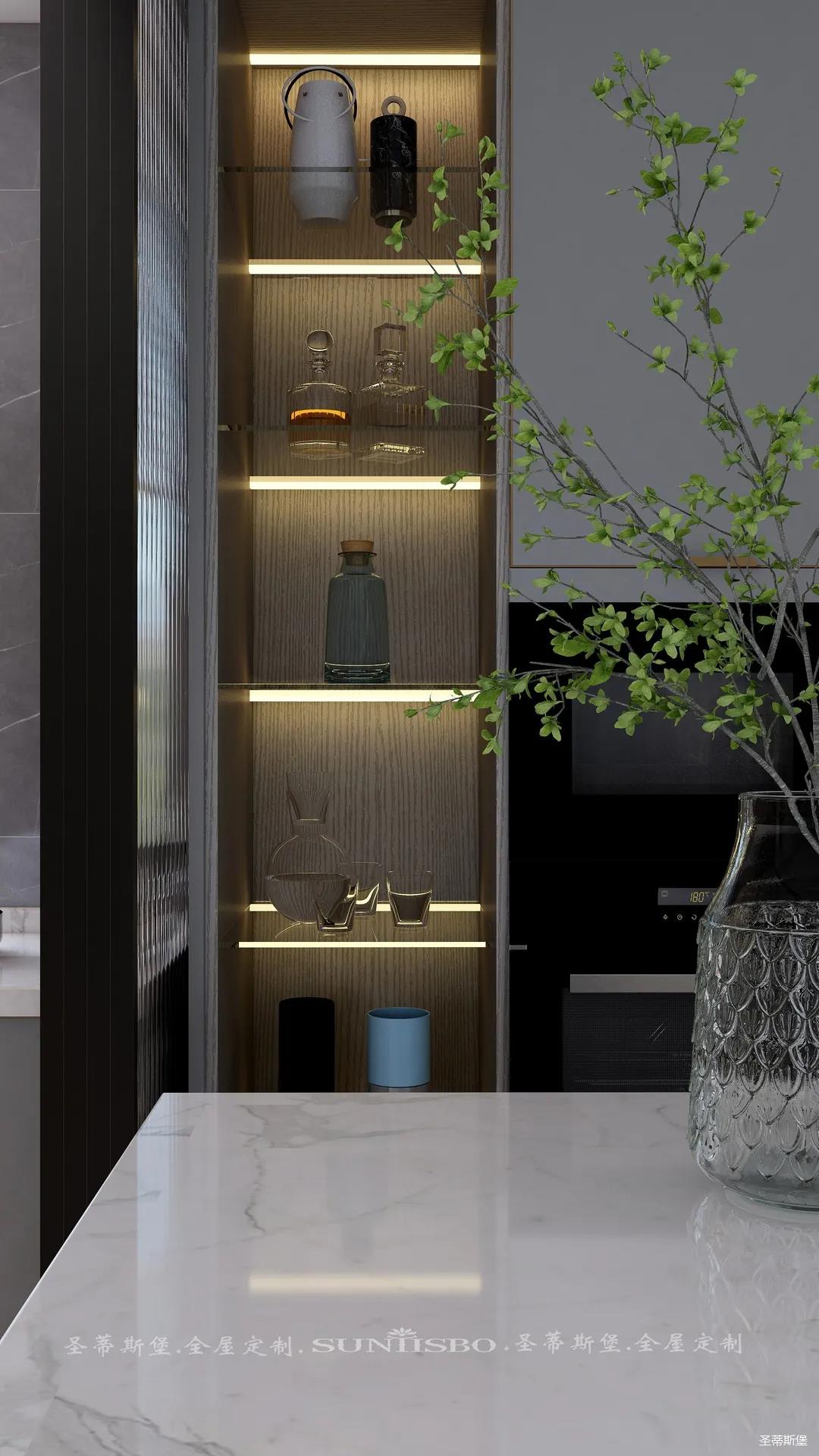 廚房是獨屬我的一片小天地,設計師充分利用了材質特性,定制高柜,根據我的用廚習慣進行收納區域劃分,極簡大氣的外部結構實則蘊藏著超乎想象的大收納空間。