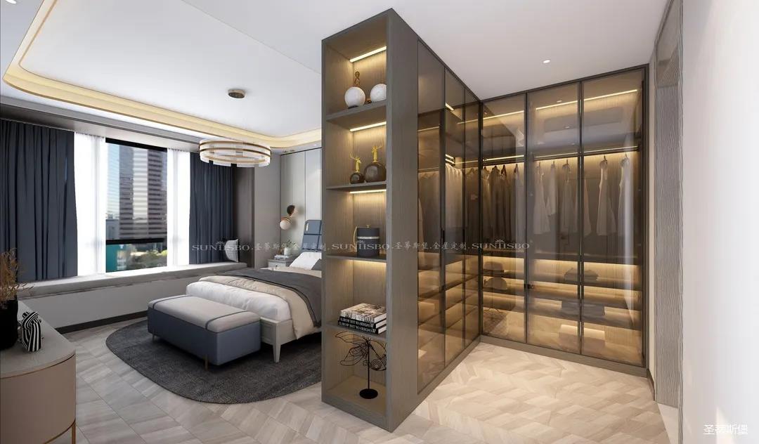 設計師不浪費每一寸空間,將主臥的大空間劃分出一個步入式的L型衣帽間,當即隔斷了進門對床的尷尬,滿足了我一直以來擁有獨立衣帽間的夢想,它不僅是個收納場所,更是臥室的質感體現。