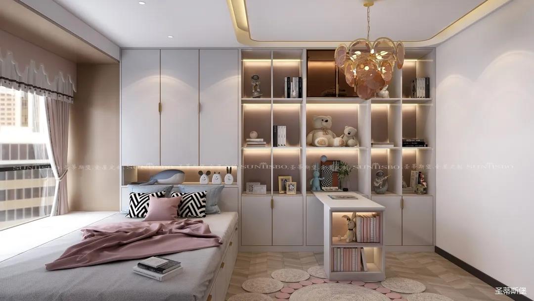 定制柜獨特設計滿足了女兒對臥室的功能需求,一字型定制柜挑出臺面設計,直接打造便利書桌,視覺上將空間分割成兩個不同的趣味空間,實現了一房多用,簡直完美!