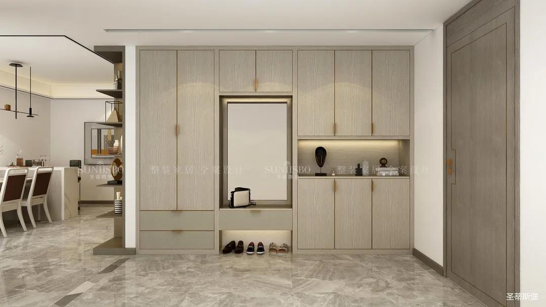 玄關柜采用內嵌式設計,柜體合理分區(qū),可涵蓋大量入戶閑置物品。