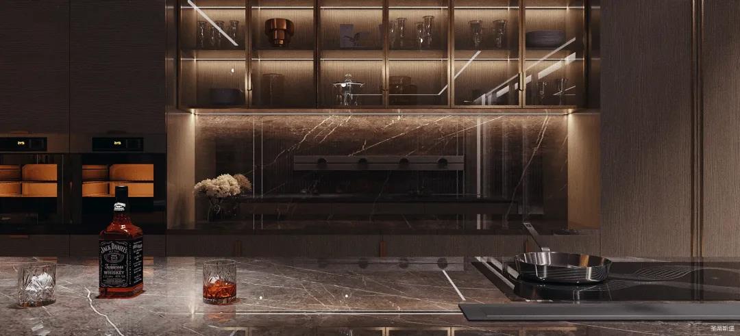 餐廚的極簡也可兼具多元,以一字內(nèi)嵌式展開的廚區(qū)收納柜,兼顧了從杯具、調(diào)料等廚用材料收納到廚電歸置動(dòng)線功能處理。在展示區(qū)域,玻璃隔板組合實(shí)木定制柜的表現(xiàn)形式,更是提升了空間的明亮度與寬闊感。