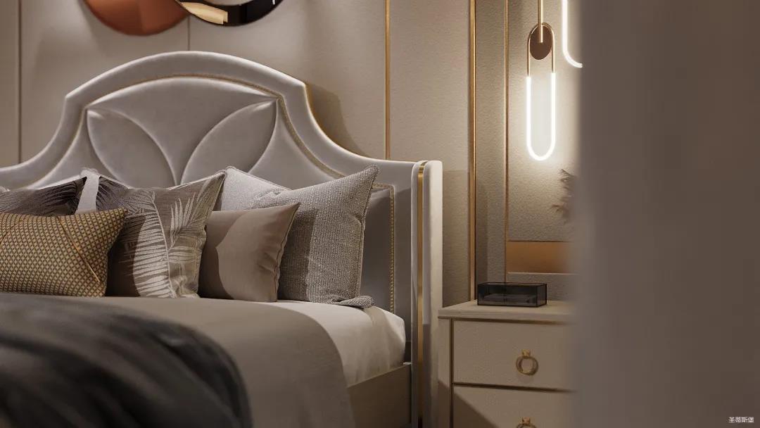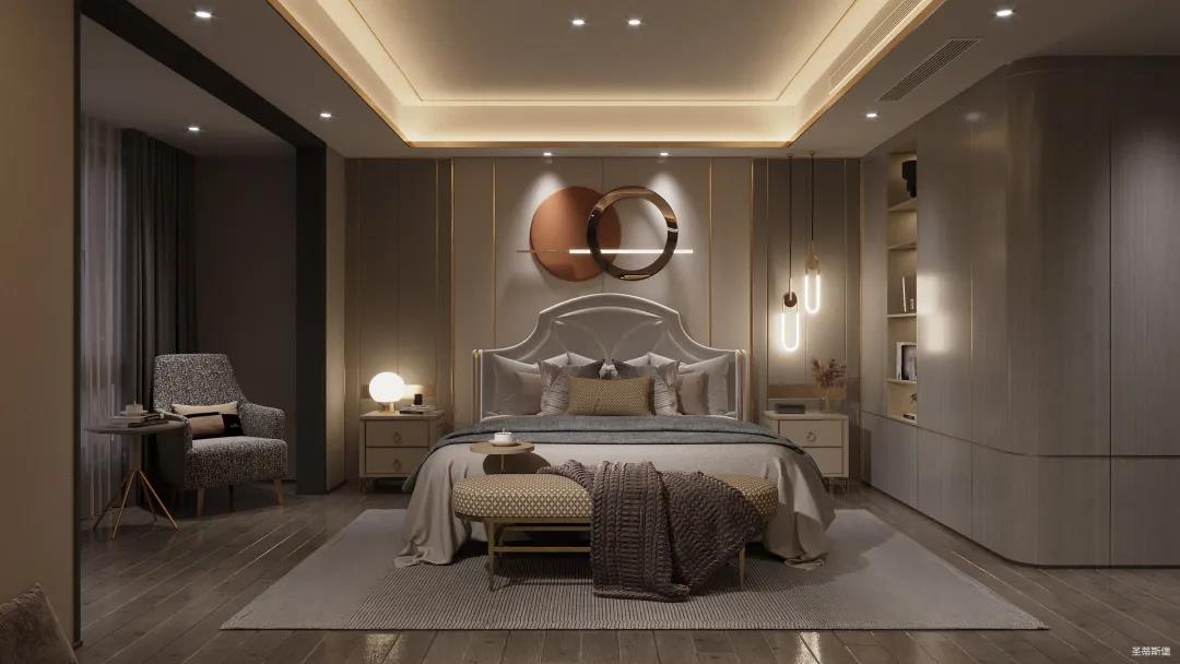 臥室空間整體以護(hù)墻板定制為主,整體設(shè)計(jì)注重空間簡約、自然,沒有繁雜的裝飾。結(jié)合業(yè)主對(duì)理想家的想象,采用暖色調(diào)來襯托溫馨實(shí)感,延伸業(yè)主對(duì)家的定義,用最質(zhì)樸的木紋融合極簡線條平鋪的形式,體悟自然的溫度,為都市生活帶去不一樣的體驗(yàn)感。