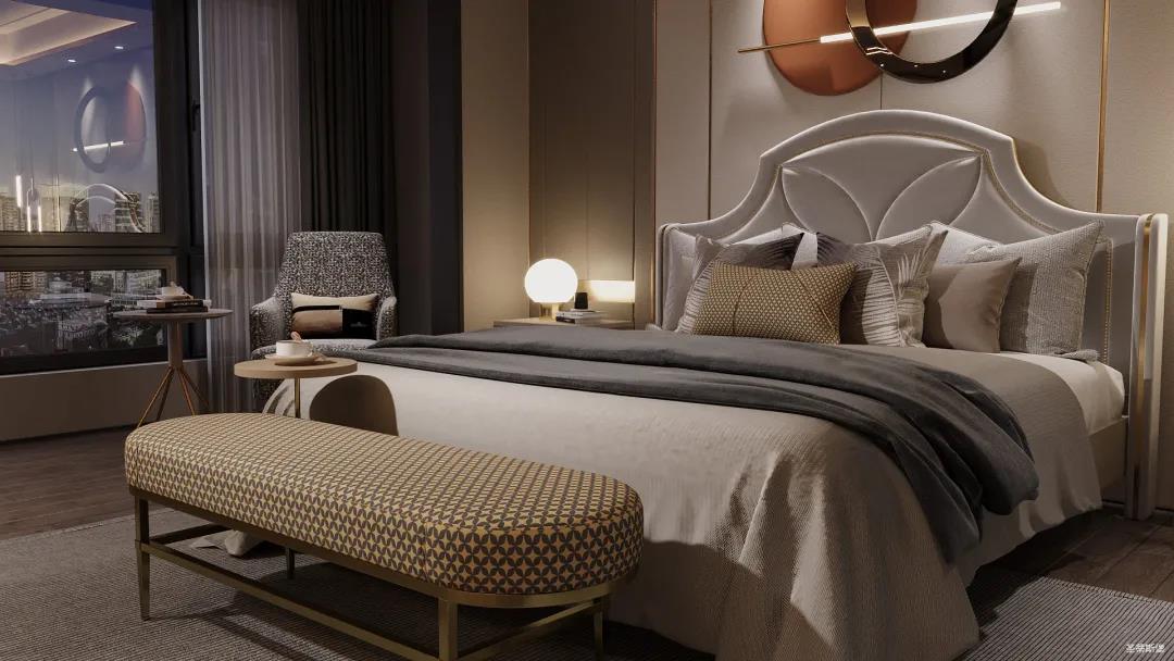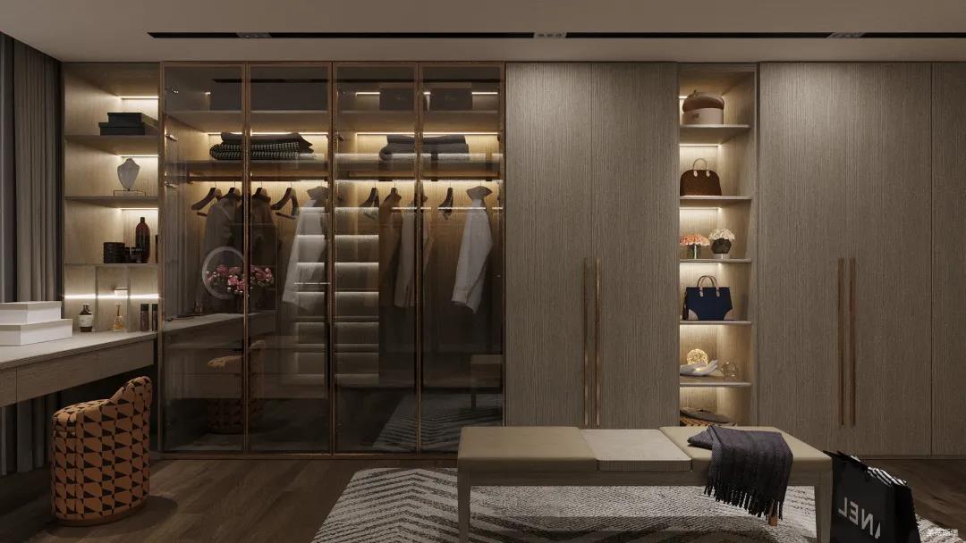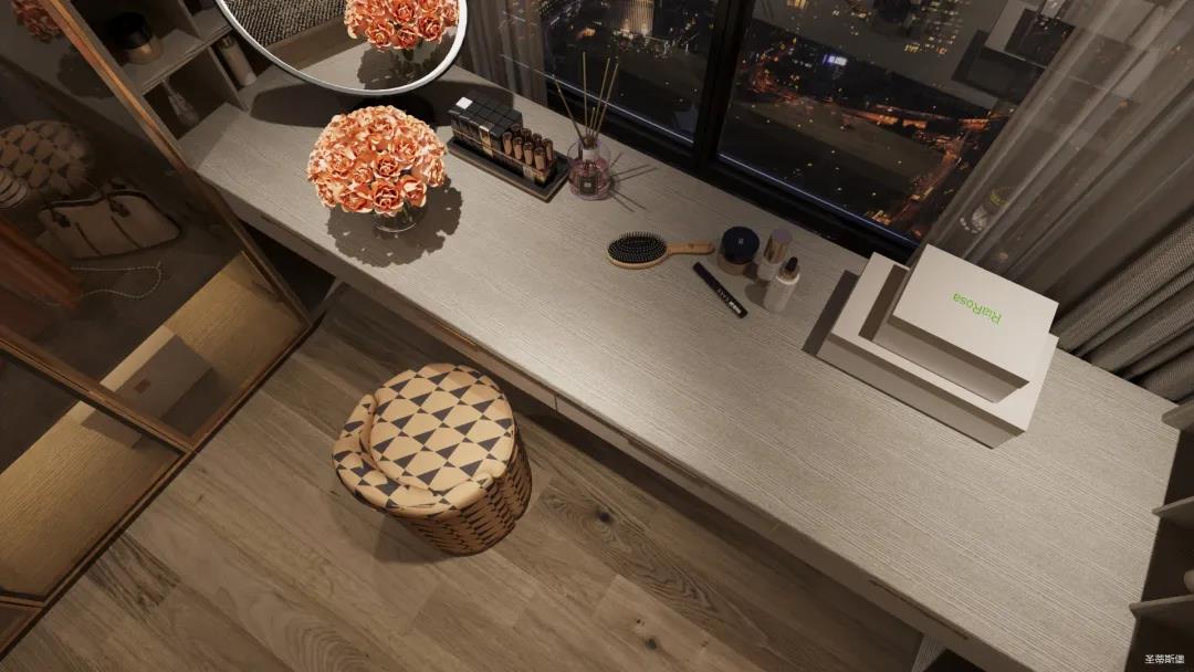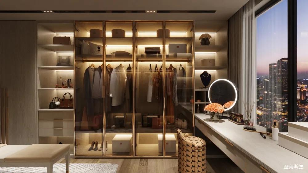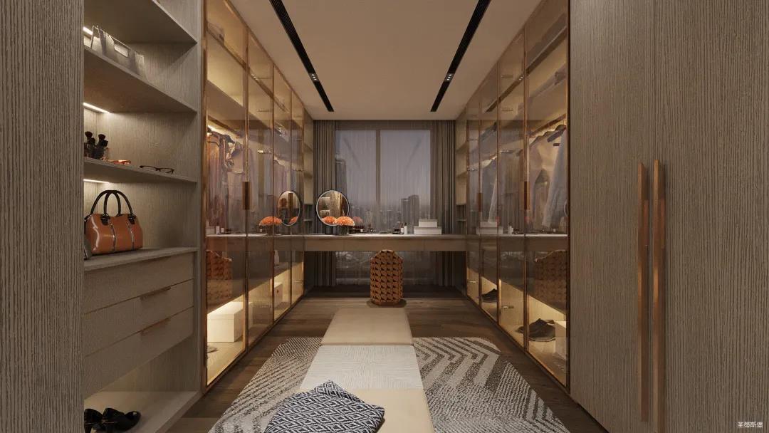 移步衣帽間,精簡華麗幾乎貫穿了整個(gè)空間,質(zhì)感高級(jí)的實(shí)木定制柜框架、通透明亮的玻璃展示區(qū)、色調(diào)醇厚的金屬鑲邊,每一項(xiàng)細(xì)節(jié)搭配都在強(qiáng)調(diào)著業(yè)主的高端品位。妝臺(tái)前的落地窗讓我們?cè)谟^賞都市繁華的同時(shí)也屏蔽了都市喧囂,讓我們置身于繁華都市中有一處寧靜休憩地。
