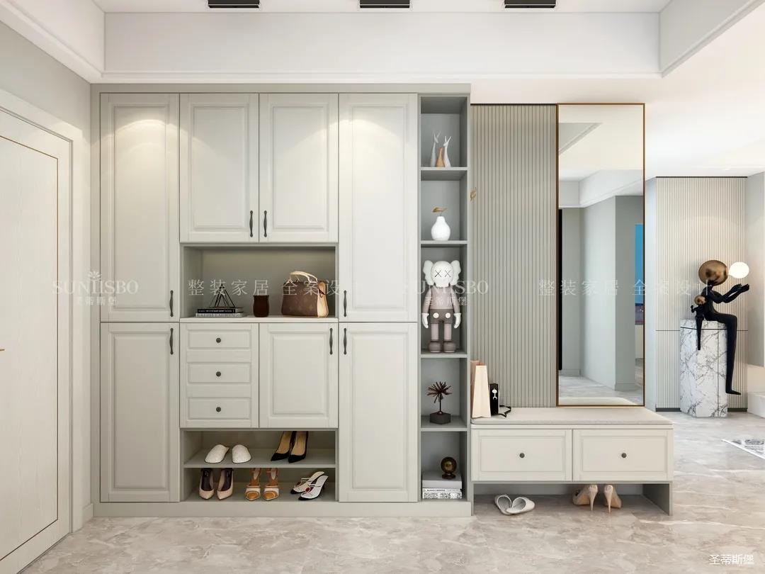 入戶側面設計一字型玄關,腰部,底部留空做層板,便于隨手放置鑰匙、鞋包等物品,中間留空設計為開放展示區,加上軟裝飾品點綴,達到業主對品質生活追求的理想狀態。應女主人要求,玄關還加長延伸出妝鏡和換鞋凳,讓動線自然流暢。