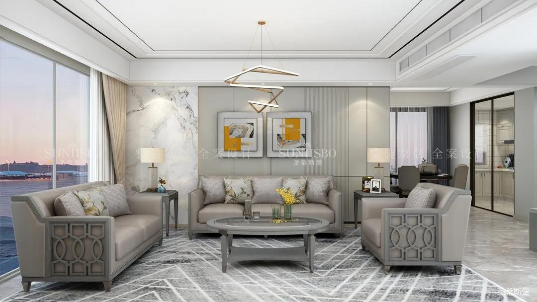 客廳在太陽的余暉下襯得柔和樸素,通透自然。超大江景落地窗,引入充足的自然光線灑向屋內,整體空間去除繁復的設計,以柔和的線條作為鋪設,沙發側面與地毯中的幾何造型組建了一個極富藝術感的空間,采用天然實木材質制作的家具和織物,色彩淡雅且不張揚。隨處可見的藝術造型裝飾,無一不展示著美式格調中輕奢的韻味。