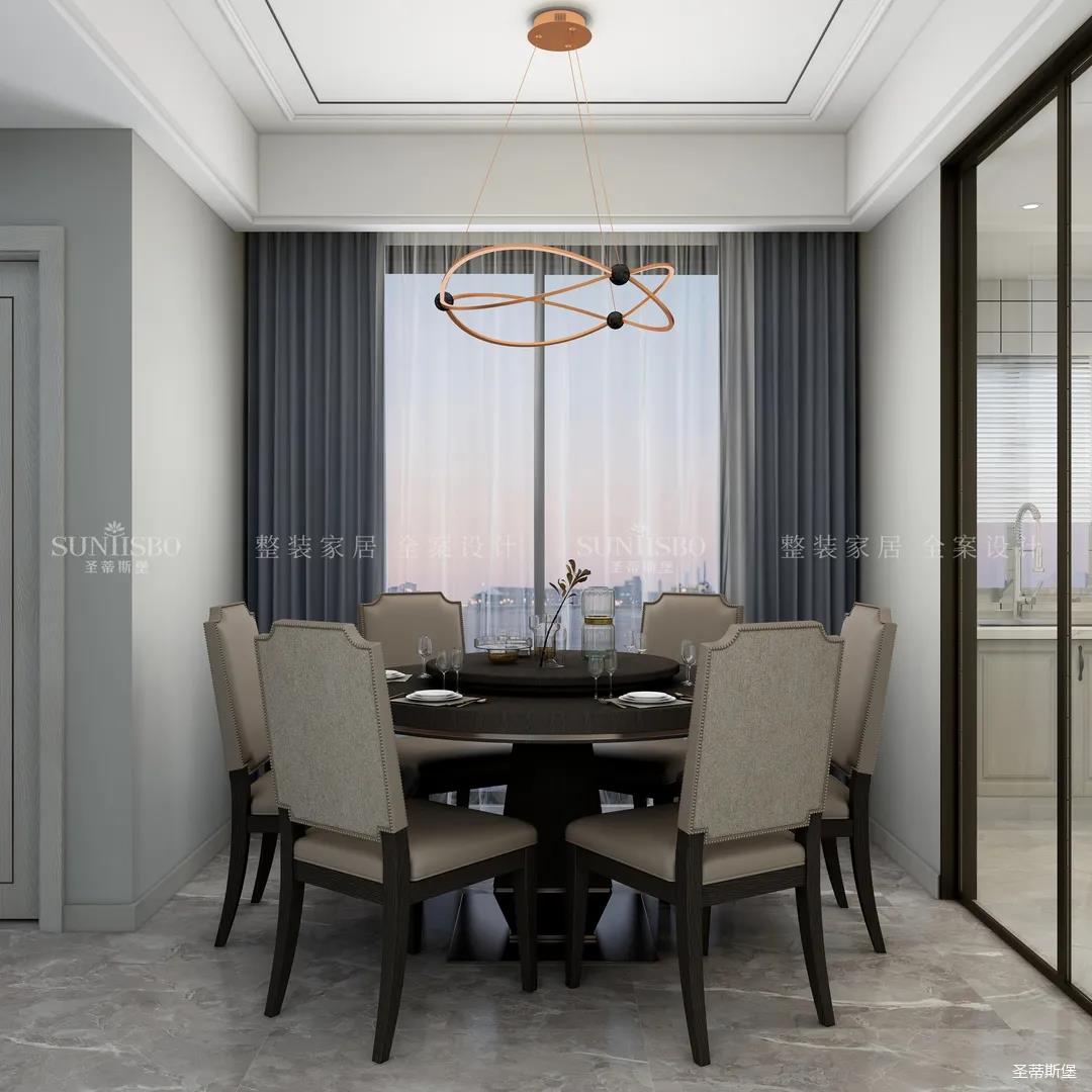 餐廳空間由于戶型空間有限,僅用淺色的護墻與深色的餐桌椅,在視覺上加深空間的縱深感,打造了滿足用餐、會客、社交的多重需求空間,把業主對一家人圍桌用餐的憧憬變成可落地居家場景。