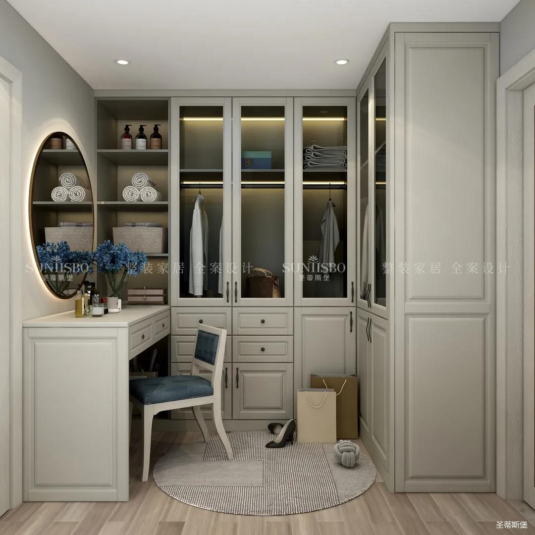利用主臥多出來的小空間,設計打造出步入式衣帽間。定制了L型的轉角衣柜,提供了超強的收納空間。圓形的裝飾地毯與妝鏡相呼應,彰顯著空間女主人對精致生活的態度。