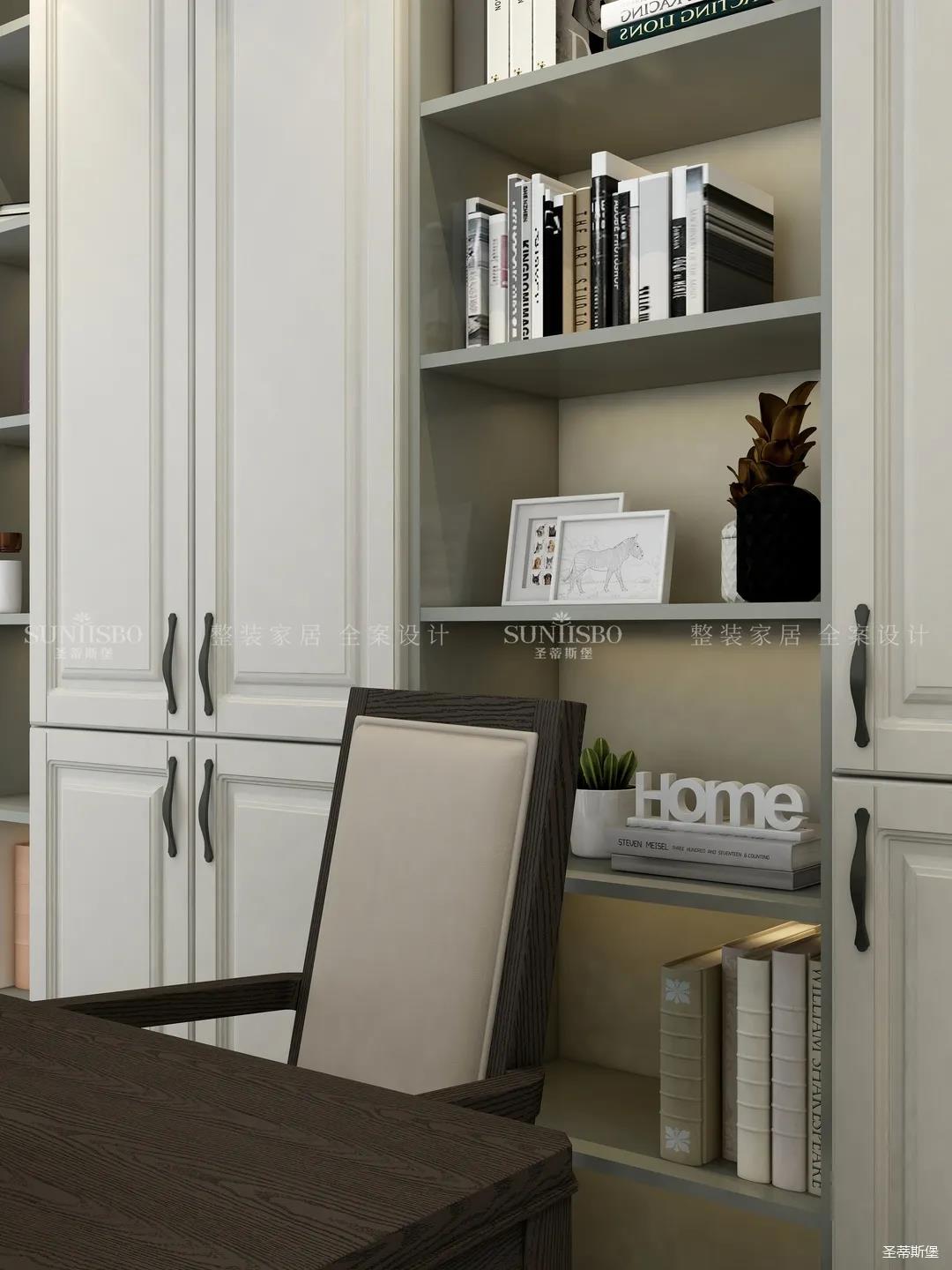 書房以黑白灰,作為打造舒適家居的經典配色。深灰書桌,淺灰地毯,仿古白定制書柜,三者搭配帶著與生俱來的時尚藝術范。整體沒有絢麗多彩的顏色,卻總能令人耳目一新,只一眼便愛上這舒適的閱讀空間。