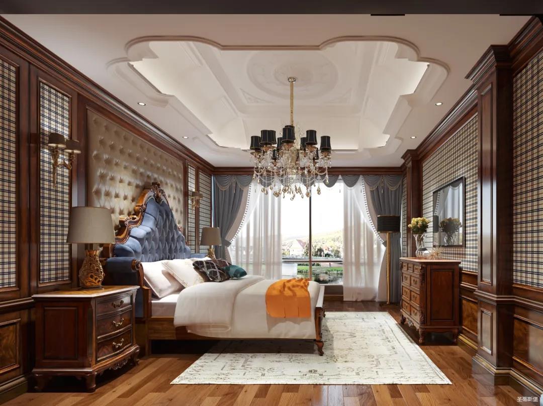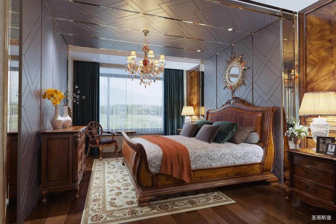 主臥整體設計是美式與現代的完美整合,既保留了純正美式的形和實木雕刻藝術,又具有濃重的美式配色,濃濃的藝術氣息不自覺在浪漫的美式空間流淌。流暢的弧線花飾以及豐富的木作線條別具匠心。大氣穩重與舒適雅致并重,并借由開放的布局、靈活的動線,共同促成了整個空間極具復古浪漫的情調。
