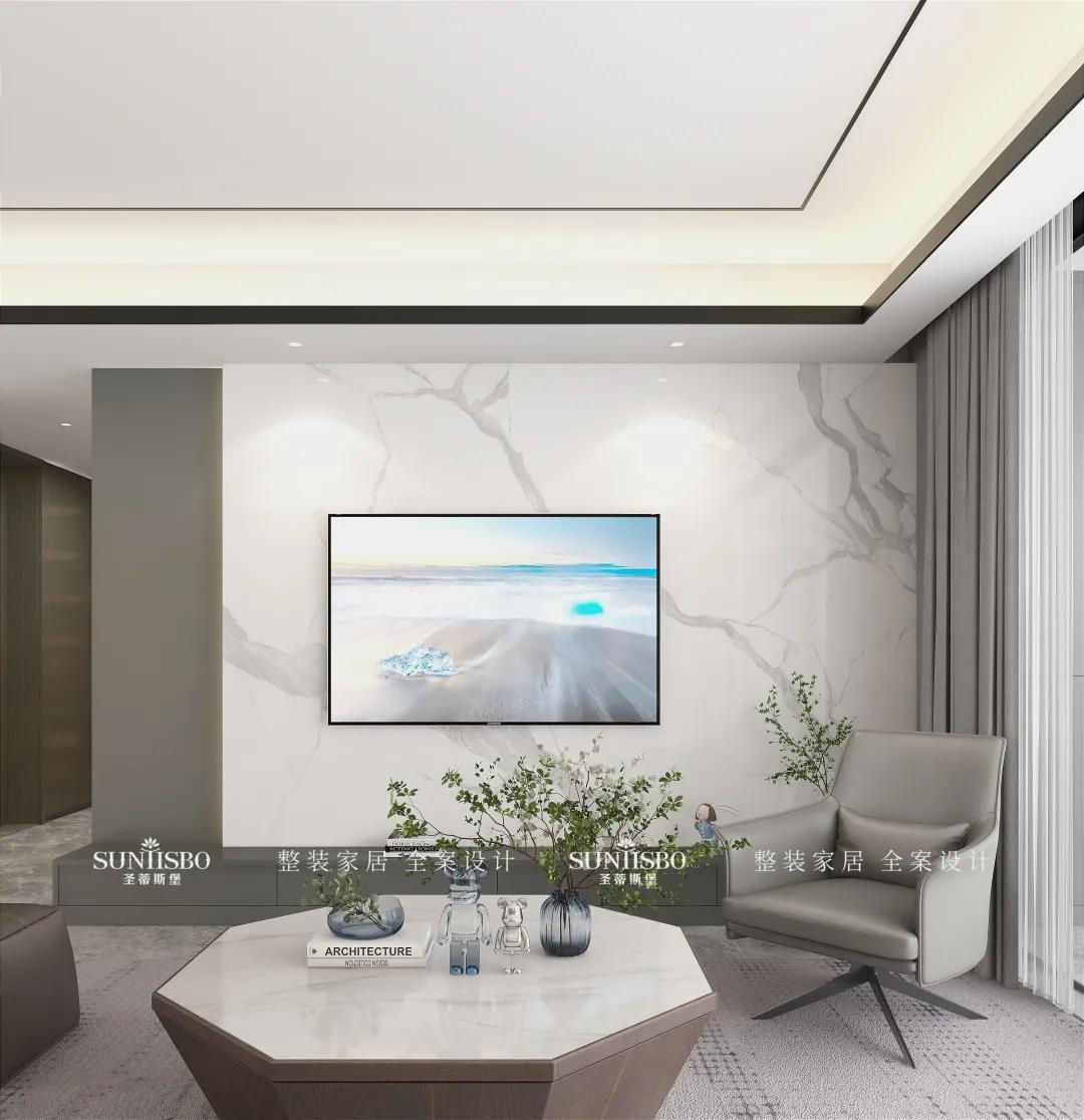 客廳根據業(yè)主太太的喜好而設計,茶幾采用純天然爵士白大理石,自然天成的石材紋理,通過留白的藝術表現(xiàn)手法,營造出自然靈動、沉穩(wěn)時尚的意境。從細節(jié)處彰顯對生活的態(tài)度與追求,打造高品位的現(xiàn)代家居。