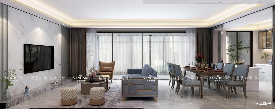 設計師通過對居者在空間中互動關系的細致設想,遵循經典的簡奢風格設計,細膩考究人居與空間關系,反復推敲布局,將客餐廳橫列排布,增加居者的交流互動。